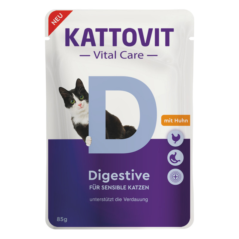 Někdy mohou mít naši čtyřnozí spolubydlící trochu citlivější zažívání. Pro takové případy je tu Kattovit Vital Care Digestive s kuřecím. Mokré krmivo bylo speciálně vyvinuto odborníky na výživu tak, aby příliš nezatěžovalo trávicí trakt a umožnilo mu plně si vychutnat jídlo.