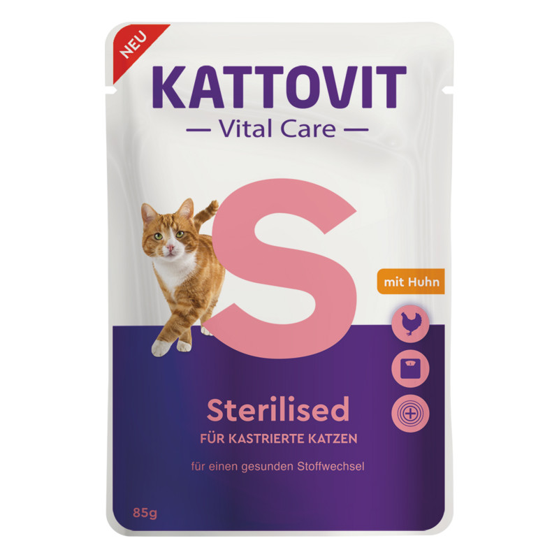 Lahodné mokré krmivo s kuřecím pro kastrované nebo sterilizované kočky, podporuje normální funkci močových cest. Kastrované kočky mají obvykle poněkud jiné požadavky na stravování. Často mívají větší nadváhu nebo se více potýkají s problémy s močovými cestami. Kattovit Vital Care Sterilised Pouches Chicken se zaměřuje přesně na tyto potřeby. Obsahuje například DL-methionin, který okyseluje moč a přispívá k normální funkci močových cest.