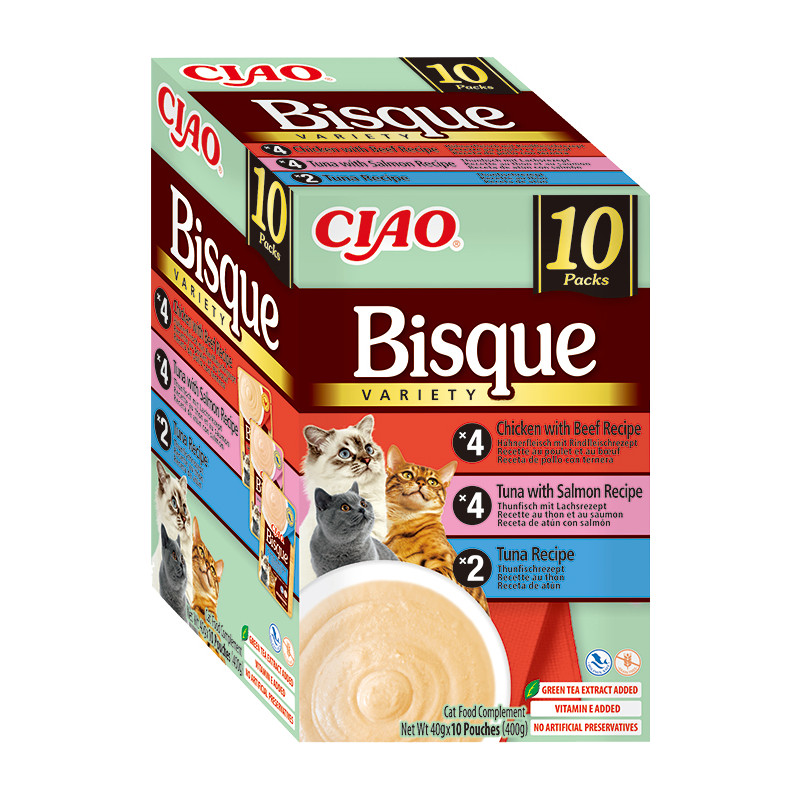 CIAO BISQUE Multipack obsahuje 10 lahodných krémových pamlsků s obsahem masa z tuňáka,lososa, kuřete a hovězího. Pečlivě vybrané suroviny a přísně kontrolovaná čerstvost. Vaše kočka si bude užívat lákavé aroma a neodolatelnou chuť při každém otevření kapsičky! Vyrobeno z tuňáka uloveného v moři. Žádné obiloviny, konzervanty ani umělá barviva. Vysoký obsah vody, který je prospěšný pro celkové zdraví koček. Nízký obsah kalorií.