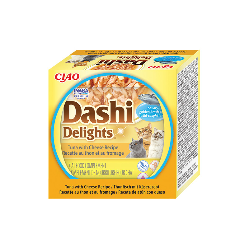 Oblíbené Dashi nyní v tuňákové receptuře se sýrem a bez kuřecího masa. Dashi je tradiční japonský rybí vývar z tuňákových vloček, který je známý svou vyjímečnou, lahodnou chutí. Zařazení Dashi do jídelníčku vaší kočky může dodat krmení nový rozměr a učinit ho vyjímečným zážitkem. Nejde jen o chuť - dashi může poskytnout i důležité živiny včetně vitamínů a minerálů. Dashi má nízký obsah kalorií a tuku, takže je zdravým doplňkem stravy vaší kočky. Je to produkt na bázi vývaru, což znamená, že obsahuje vysoké množství vody a tím pomáhá udržet zdraví vaší kočky. Dashi se může stát chutným a výživným doplňkem stravy vaší kočky, který si díky její neodolatelné chuti určitě zamiluje. Všechny produkty Inaba jsou vždy bez obilovin, zbytečných ingrediencí a pochybných přísad a jsou vyrobené z pravého mořského tuňáka. Hydratační, výživné a vždy lahodné. Dashi potěší.