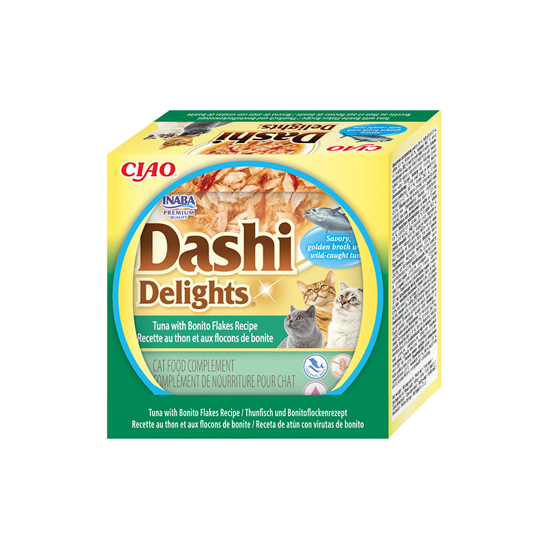 Oblíbené Dashi nyní v tuňákové receptuře s bonito vločkami a bez kuřecího masa. Dashi je tradiční japonský rybí vývar z tuňákových vloček, který je známý svou vyjímečnou, lahodnou chutí. Zařazení Dashi do jídelníčku vaší kočky může dodat krmení nový rozměr a učinit ho vyjímečným zážitkem. Nejde jen o chuť - dashi může poskytnout i důležité živiny včetně vitamínů a minerálů. Dashi má nízký obsah kalorií a tuku, takže je zdravým doplňkem stravy vaší kočky. Je to produkt na bázi vývaru, což znamená, že obsahuje vysoké množství vody a tím pomáhá udržet zdraví vaší kočky. Dashi se může stát chutným a výživným doplňkem stravy vaší kočky, který si díky její neodolatelné chuti určitě zamiluje. Všechny produkty Inaba jsou vždy bez obilovin, zbytečných ingrediencí a pochybných přísad a jsou vyrobené z pravého mořského tuňáka. Hydratační, výživné a vždy lahodné. Dashi potěší.