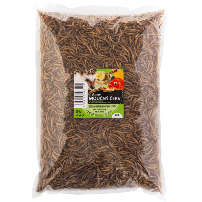 Larvy sušeného moučného červa jsou vhodným doplňkem stravy ptáků vč. drůbeže, ryb, ještěrek, leguánů, želv, žab, ježků, křečků, myší, potkanů a jiných malých savců, koček a psů.
