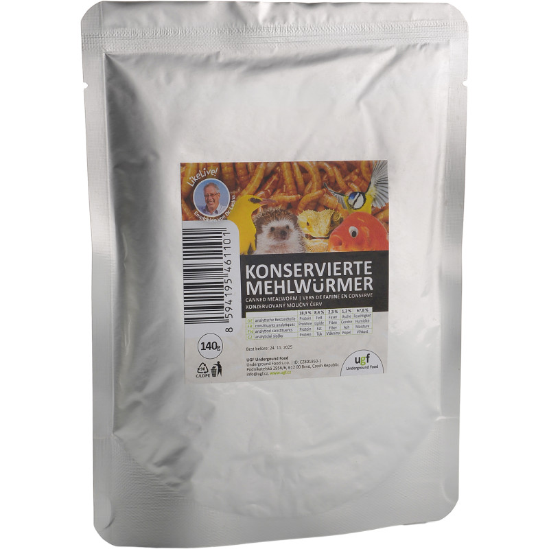 Konzerva moučného červa je 100% přírodní doplňkové krmivo s vysokým obsahem bílkovin. Konzervovaný moučný červ chutná plazům, ježkům, ptákům i hlodavcům. Skvěle se hodí také pro přikrmování drůbeže. Díky šetrnému zavařování zůstává moučný červ vizuálně nezměněn a krmená zvířata na něj pozitivně reagují. Zachovává si také vlhkost a cenné nutriční látky, které jsou tolik potřebné pro výživu zvířat.