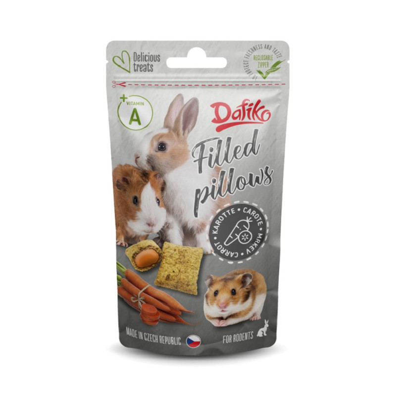 Chutný pamlsek ve formě křupavých polštářků plněných mrkví, vhodný jako odměna nebo zpestření běžné denní krmné dávky hlodavců. Díky obsahu mrkve a přidaných vitaminů je pamlsek nejen chutný, ale i funkční.