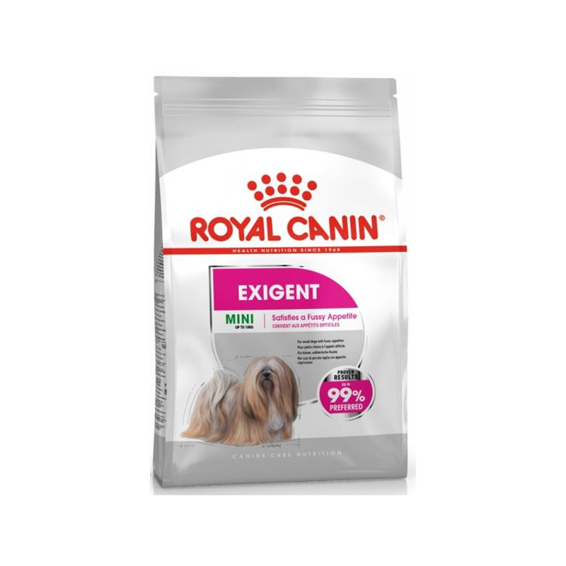 Někteří psi malých ras jsou obzvlášť mlsní, což komplikuje výběr krmiva. Časté změny druhu krmiva, upřednostňování určitých ingrediencí a alergie na některé suroviny způsobuje, že se pes stává vybíravým. Proto potřebujete krmivo, které je psy dobře přijímáno a které si psa získá speciálním tvarem granulí-kroketkami- a chutí. Krmivo by mělo být více než jen vyváženým poměrem živin - Royal Canin Mini Exigent podporuje svým složením i zdravou kůži a krásnou srst. Psi menších ras mají menší chrup než zástupci větších ras, jejich zuby jsou těsněji u sebe. Zbytky krmiva se proto mohou usazovat v mezerách mezi zuby, což podporuje vznik zubního kamene. Speciální kroketky s fosfáty sodíku pomáhají chránit před zubním kamenem.
