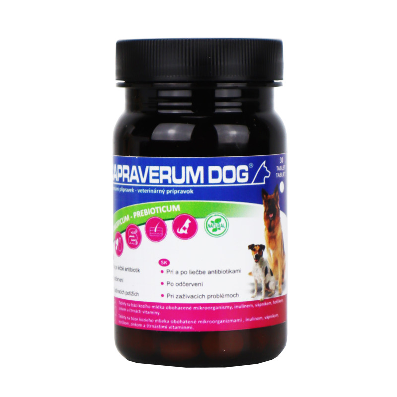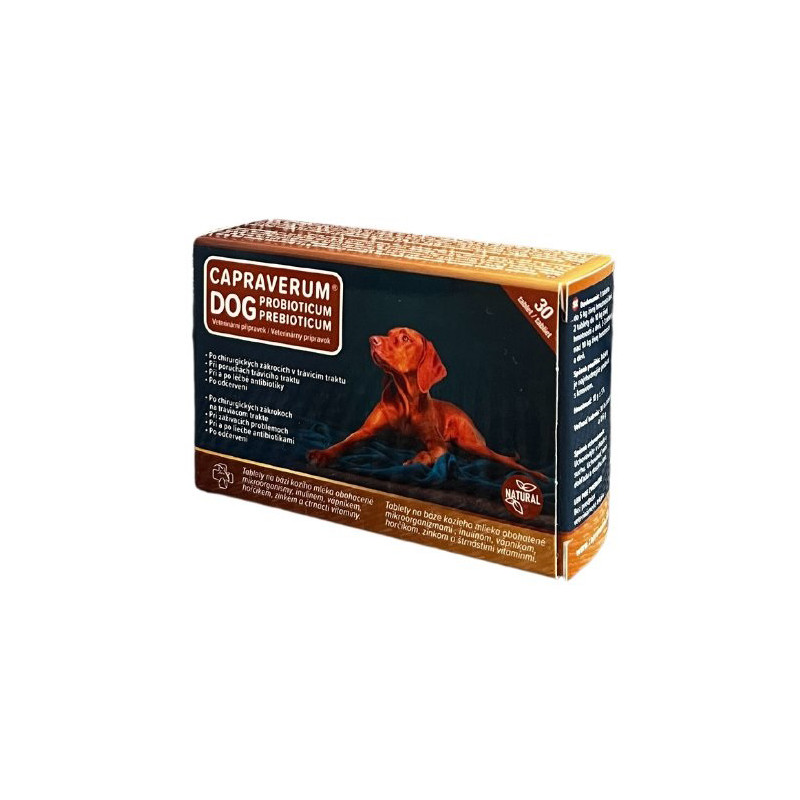 CAPRAVERUM DOG probioticum - prebioticum jsou tablety na bázi kozího mléka obohacené o všechny nejdůležitější vitamíny a užitečnou živou mikroflóru (Enterococcus faecium), inulín. Inulín je rozpustná fermentovatelná vláknina, která plní s kozím mlékem prebiotickou funkci a podporuje růst žádoucí střevní mikroflóry. Tablety mají optimální poměr minerálních látek nutných pro tvorbu kostí (vápník, fosfor, hořčík a zinek), s obsahem všech esenciálních aminokyselin a lehce stravitelných tuků. Zlepšuje stravitelnost živin z krmné dávky, působí příznivě na činnost trávicího traktu, jater a slinivky. Komplex živé mikroflóry, vitamínů a zinku chrání trávicí trakt a kůži, podílí se na obraně organismu před infekcemi. Pomáhá obnovit zdravou střevní mikroflóru při léčbě antibiotiky a po jejím ukončení. Napomáha k prevenci a léčbě střevních onemocnění.