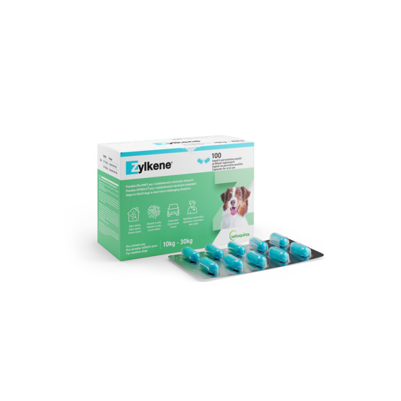 Kapsle Zylkene® obsahují přírodní složku s prokázaným zklidňujícím účinkem, která se získává z mléčné bílkoviny zvané kasein. Alfa-kasozepin, přírodní bioaktivní peptid odvozený z mléka, navozuje uvolnění a relaxaci novorozeňat při sání mateřského mléka. Zylkene® je doplňkové krmivo, které je doporučováno pro použití u psů a koček, kteří reagují příliš bojácně. Zlepšuje přizpůsobivost zvířat a podporuje obnovu jejich přirozeného chování. S podáváním Zylkene® začněte ještě před očekávanou událostí a pokračujte až do obnovení psychické rovnováhy zvířete.