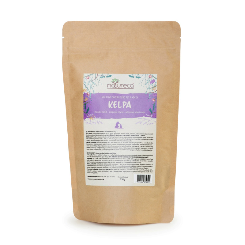 Kelpa je hnědá mořská řasa (chaluha) s vysokým obsahem minerálních látek a jódu. Silná podpora přirozené imunity, antioxidant, podpora trávení a pigmentace kůže i srsti, odstraňuje zubní kámen a pach z tlamy. Je to jedinečný zdroj jódu.