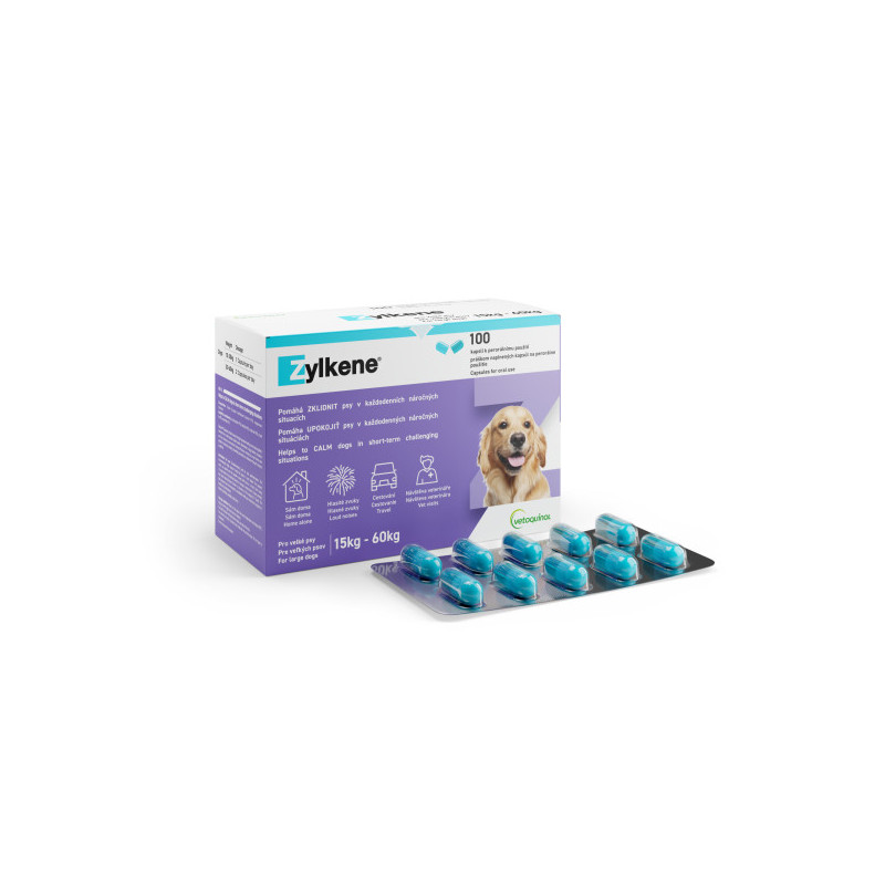 Kapsle Zylkene® obsahují přírodní složku s prokázaným zklidňujícím účinkem, která se získává z mléčné bílkoviny zvané kasein. Alfa-kasozepin, přírodní bioaktivní peptid odvozený z mléka, navozuje uvolnění a relaxaci novorozeňat při sání mateřského mléka. Zylkene® je doplňkové krmivo, které je doporučováno pro použití u psů a koček, kteří reagují příliš bojácně. Zlepšuje přizpůsobivost zvířat a podporuje obnovu jejich přirozeného chování. S podáváním Zylkene® začněte ještě před očekávanou událostí a pokračujte až do obnovení psychické rovnováhy zvířete.