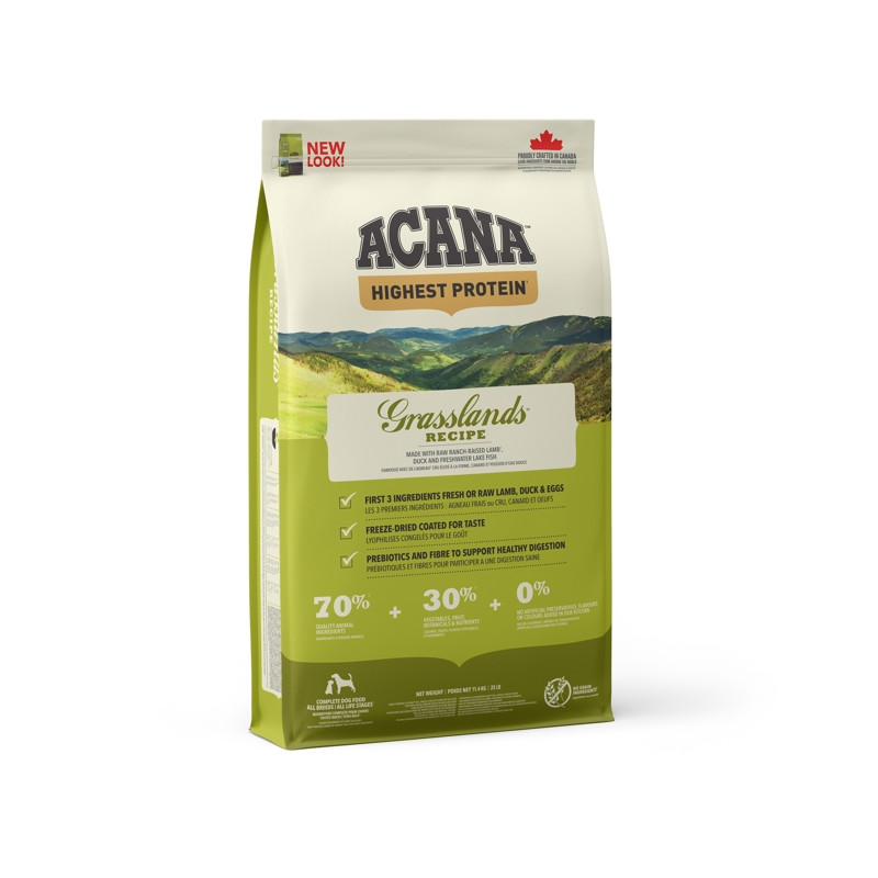 ACANA GRASSLANDS OBSAHUJE MASO Z VOLNĚ CHOVANÝCH JEHŇAT, KACHEN A KRŮT, VEJCE Z HNÍZDNÍCH CHOVŮ A RYBY, VŠE DODÁVANÉ ČERSTVÉ NEBO SYROVÉ Z NAŠEHO REGIONU V PODÍLU CELÉ KOŘISTI, COŽ DODÁVÁ ŽIVINY PŘIROZENĚ, BEZ POTŘEBY DLOUHÉHO SEZNAMU UMĚLÝCH DOPLŇKŮ. S NÍZKÝM OBSAHEM SACHARIDŮ A VYSOKÝM OBSAHEM ŽIVOCIŠNÝCH PROTEINŮ PRO DOSAŽENÍ VRCHOLOVÉ KONDICE.
