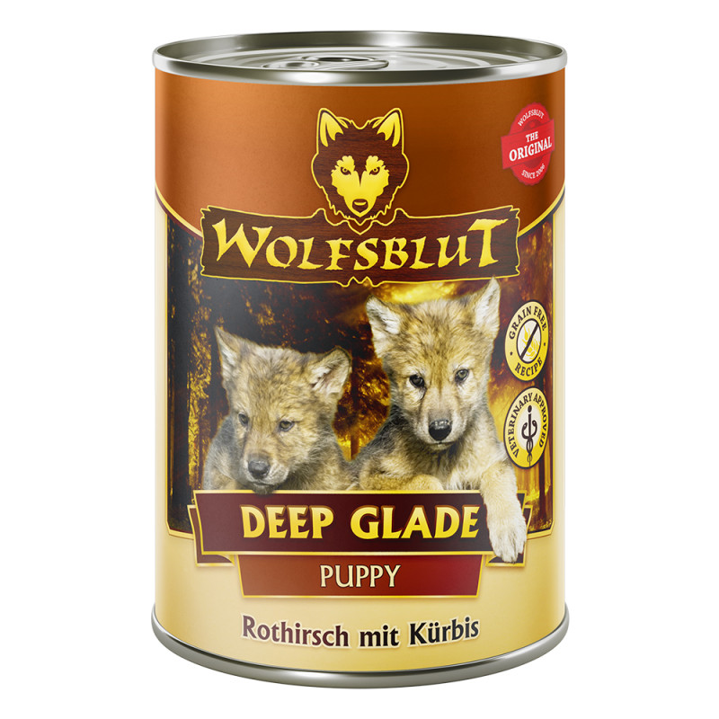 Vlci loví svou kořist od Skalistých hor Severní Ameriky, arktické tundry, hor a lesů Evropy až po pouště a stepi střední Asie. To jim dodává maso a vnitřnosti bohaté na živiny, ale také zeleninu, ovoce, bobule, kořeny a bylinky z obsahu žaludku kořisti. Obilí zde není zahrnuto. Vlk tak přijímá potřebné vitamíny, minerály, stopové prvky, enzymy a druhotné rostlinné látky. Vzhledem k tomu, že vlk je předkem všech psů, naše mokré krmivo Wolfsblut je založeno na přirozených stravovacích návycích vlka. Obsahuje hodně masa nebo ryb v kombinaci se superpotravinami, které obsahují hodnotné ingredience – stejně jako v přírodě, bez obilovin. Náš výběr výjimečných druhů masa a superpotravin bohatých na živiny vychází z vlčích biotopů a jejich pestré stravy. Wolfsblut nabízí každému psovi druhově vhodnou a originální stravu a díky rozmanitosti odrůd si každý najde něco, co snese. Jednotlivé složky potravy DEEP GLADE PUPPY byly sestaveny společně s veterináři tak, aby vyhovovaly přirozenému chování vlka kořisti a poznatkům o holistické výživě psů. Mokré krmivo Wolfsblut je jedinečné a obsahuje mnoho superpotravin.