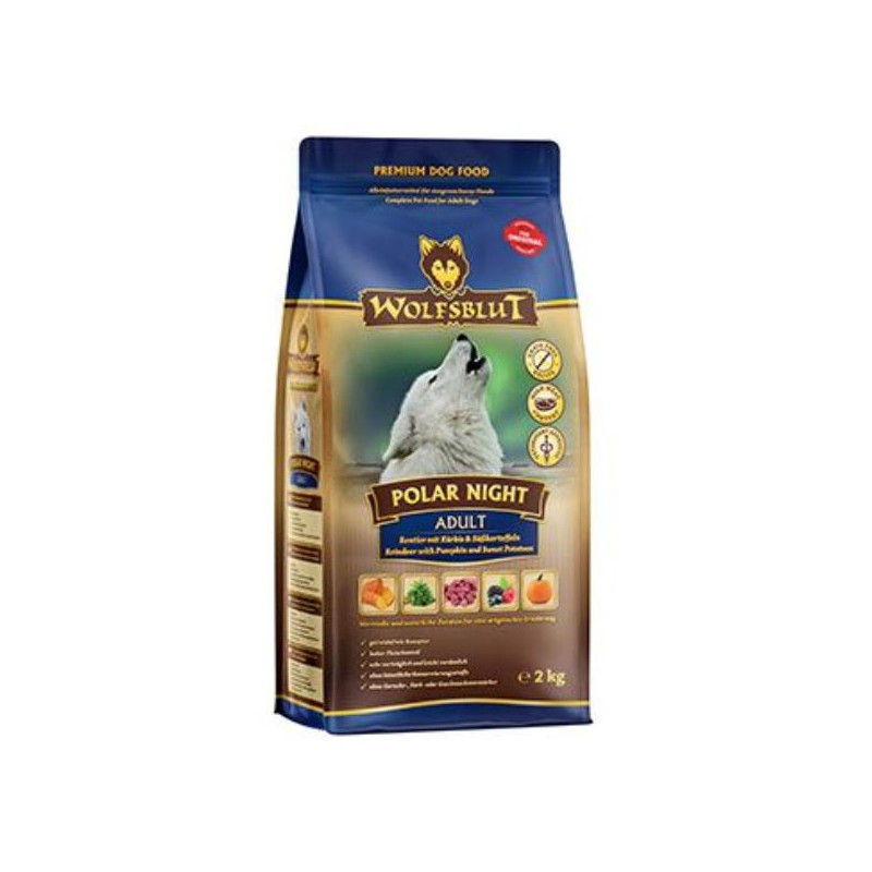 Vlci loví svou kořist od Skalistých hor Severní Ameriky, arktické tundry, hor a lesů Evropy až po pouště a stepi střední Asie. To jim dodává maso a vnitřnosti bohaté na živiny, ale také zeleninu, ovoce, bobule, kořeny a bylinky z obsahu žaludku kořisti. Obilí zde není zahrnuto. Vlk tak přijímá potřebné vitamíny, minerály, stopové prvky, enzymy a druhotné rostlinné látky. Vzhledem k tomu, že vlk je předkem všech psů, naše suché krmivo pro psy Wolfsblut je založeno na přirozených stravovacích návycích vlka. Obsahuje hodně masa nebo ryb v kombinaci se superpotravinami, které obsahují hodnotné ingredience – stejně jako v přírodě, bez obilovin. Náš výběr výjimečných druhů masa a superpotravin bohatých na živiny vychází z vlčích biotopů a jejich pestré stravy. Wolfsblut nabízí každému psovi druhově vhodnou a originální stravu a díky rozmanitosti odrůd si každý najde něco, co snese. Receptura suchého krmiva POLAR NIGHT ADULT kombinuje výživu vlků s nejnovějšími vědeckými poznatky o správné výživě psů.