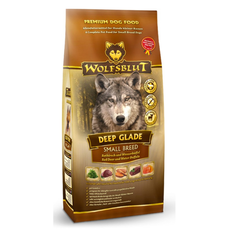 Vlci loví svou kořist od Skalistých hor Severní Ameriky, arktické tundry, hor a lesů Evropy až po pouště a stepi střední Asie. To jim dodává maso a vnitřnosti bohaté na živiny, ale také zeleninu, ovoce, bobule, kořeny a bylinky z obsahu žaludku kořisti. Obilí zde není zahrnuto. Vlk tak přijímá potřebné vitamíny, minerály, stopové prvky, enzymy a druhotné rostlinné látky. Vzhledem k tomu, že vlk je předkem všech psů, naše suché krmivo pro psy Wolfsblut je založeno na přirozených stravovacích návycích vlka. Obsahuje hodně masa v kombinaci se superpotravinami, které obsahují hodnotné ingredience – stejně jako v přírodě, bez obilovin. Náš výběr výjimečných druhů masa a superpotravin bohatých na živiny vychází z vlčích biotopů a jejich pestré stravy. Wolfsblut nabízí každému psovi druhově vhodnou a originální stravu a díky rozmanitosti odrůd si každý najde něco, co snese. Receptura suchého krmiva DEEP GLADE SMALL BREED kombinuje výživu vlků s nejnovějšími vědeckými poznatky o správné výživě psů.
