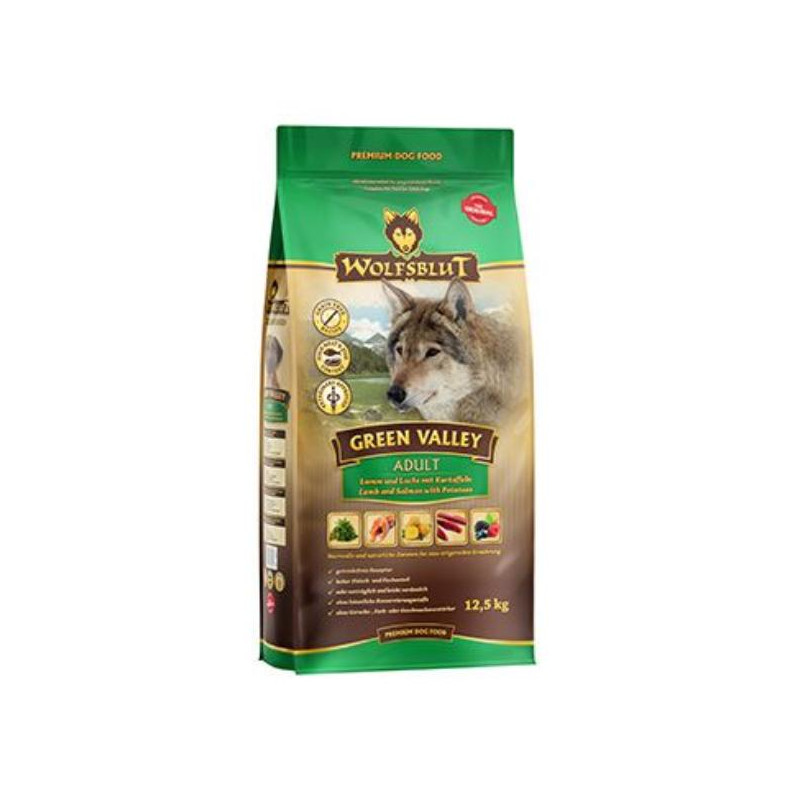 Vlci loví svou kořist od Skalistých hor Severní Ameriky, arktické tundry, hor a lesů Evropy až po pouště a stepi střední Asie. To jim dodává maso a vnitřnosti bohaté na živiny, ale také zeleninu, ovoce, bobule, kořeny a bylinky z obsahu žaludku kořisti. Obilí zde není zahrnuto. Vlk tak přijímá potřebné vitamíny, minerály, stopové prvky, enzymy a druhotné rostlinné látky. Vzhledem k tomu, že vlk je předkem všech psů, naše suché krmivo pro psy Wolfsblut je založeno na přirozených stravovacích návycích vlka. Obsahuje hodně masa nebo ryb v kombinaci se superpotravinami, které obsahují hodnotné ingredience – stejně jako v přírodě, bez obilovin. Náš výběr výjimečných druhů masa a superpotravin bohatých na živiny vychází z vlčích biotopů a jejich pestré stravy. Wolfsblut nabízí každému psovi druhově vhodnou a originální stravu a díky rozmanitosti odrůd si každý najde něco, co snese. Receptura suchého krmiva GREEN VALLEY kombinuje výživu vlků s nejnovějšími vědeckými poznatky o správné výživě psů.