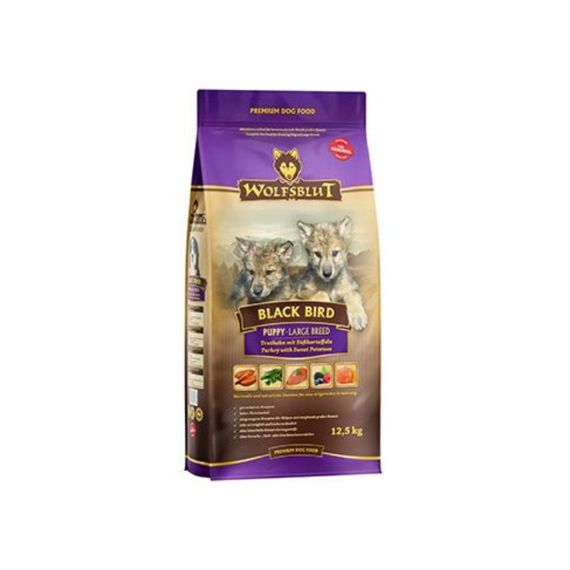 Vlci loví svou kořist od Skalistých hor Severní Ameriky, arktické tundry, hor a lesů Evropy až po pouště a stepi střední Asie. To jim dodává maso a vnitřnosti bohaté na živiny, ale také zeleninu, ovoce, bobule, kořeny a bylinky z obsahu žaludku kořisti. Obilí zde není zahrnuto. Vlk tak přijímá potřebné vitamíny, minerály, stopové prvky, enzymy a druhotné rostlinné látky. Vzhledem k tomu, že vlk je předkem všech psů, naše suché krmivo pro psy Wolfsblut je založeno na přirozených stravovacích návycích vlka. Obsahuje hodně masa nebo ryb v kombinaci se superpotravinami, které obsahují hodnotné ingredience – stejně jako v přírodě, bez obilovin. Náš výběr výjimečných druhů masa a superpotravin bohatých na živiny vychází z vlčích biotopů a jejich pestré stravy. Wolfsblut nabízí každému psovi druhově vhodnou a originální stravu a díky rozmanitosti odrůd si každý najde něco, co snese. Receptura suchého krmiva BLACK BIRD Puppy Large Breed kombinuje výživu vlků s nejnovějšími vědeckými poznatky o správné výživě psů.