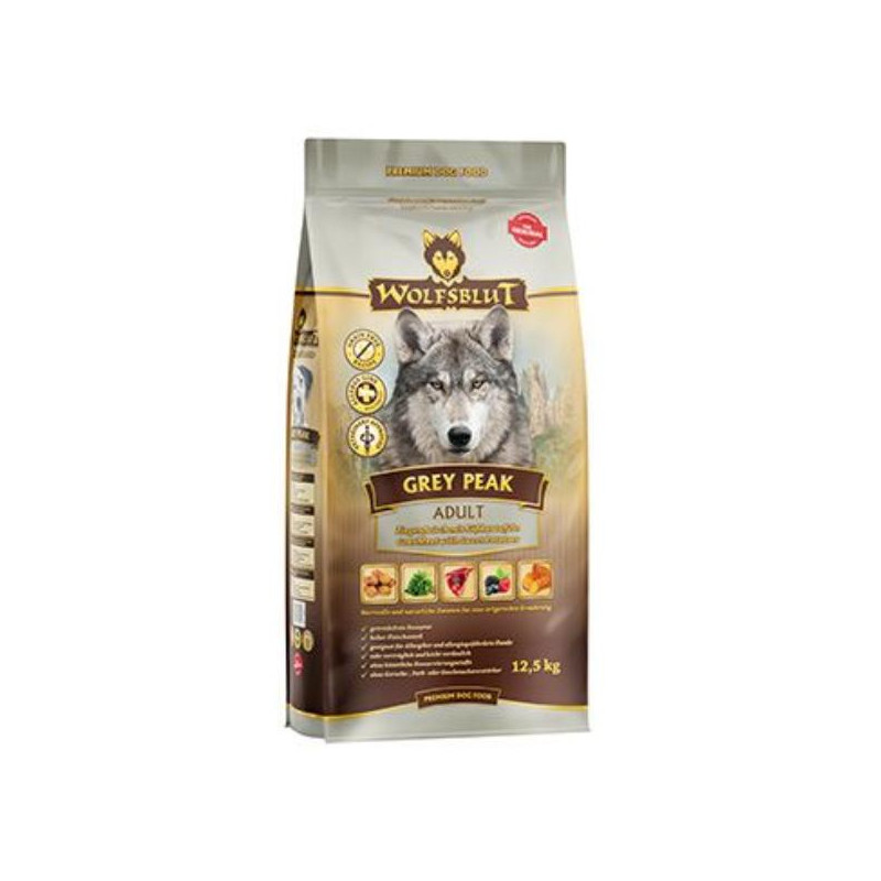 Vlci loví svou kořist od Skalistých hor Severní Ameriky, arktické tundry, hor a lesů Evropy až po pouště a stepi střední Asie. To jim dodává maso a vnitřnosti bohaté na živiny, ale také zeleninu, ovoce, bobule, kořeny a bylinky z obsahu žaludku kořisti. Obilí zde není zahrnuto. Vlk tak přijímá potřebné vitamíny, minerály, stopové prvky, enzymy a druhotné rostlinné látky. Vzhledem k tomu, že vlk je předkem všech psů, naše suché krmivo pro psy Wolfsblut je založeno na přirozených stravovacích návycích vlka. Obsahuje hodně masa nebo ryb v kombinaci se superpotravinami, které obsahují hodnotné ingredience – stejně jako v přírodě, bez obilovin. Náš výběr výjimečných druhů masa a superpotravin bohatých na živiny vychází z vlčích biotopů a jejich pestré stravy. Wolfsblut nabízí každému psovi druhově vhodnou a originální stravu a díky rozmanitosti odrůd si každý najde něco, co snese. Receptura na suché krmivo GREY PEAK ADULT kombinuje výživu vlků s nejnovějšími vědeckými poznatky o správné výživě psů.