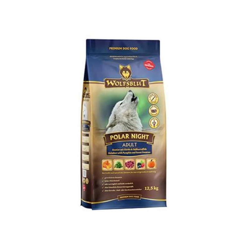 Vlci loví svou kořist od Skalistých hor Severní Ameriky, arktické tundry, hor a lesů Evropy až po pouště a stepi střední Asie. To jim dodává maso a vnitřnosti bohaté na živiny, ale také zeleninu, ovoce, bobule, kořeny a bylinky z obsahu žaludku kořisti. Obilí zde není zahrnuto. Vlk tak přijímá potřebné vitamíny, minerály, stopové prvky, enzymy a druhotné rostlinné látky. Vzhledem k tomu, že vlk je předkem všech psů, naše suché krmivo pro psy Wolfsblut je založeno na přirozených stravovacích návycích vlka. Obsahuje hodně masa nebo ryb v kombinaci se superpotravinami, které obsahují hodnotné ingredience – stejně jako v přírodě, bez obilovin. Náš výběr výjimečných druhů masa a superpotravin bohatých na živiny vychází z vlčích biotopů a jejich pestré stravy. Wolfsblut nabízí každému psovi druhově vhodnou a originální stravu a díky rozmanitosti odrůd si každý najde něco, co snese. Receptura suchého krmiva POLAR NIGHT ADULT kombinuje výživu vlků s nejnovějšími vědeckými poznatky o správné výživě psů.