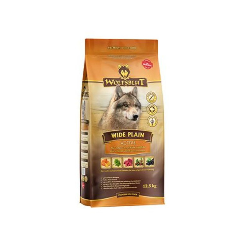 Vlci loví svou kořist od Skalistých hor Severní Ameriky, arktické tundry, hor a lesů Evropy až po pouště a stepi střední Asie. To jim dodává maso a vnitřnosti bohaté na živiny, ale také zeleninu, ovoce, bobule, kořeny a bylinky z obsahu žaludku kořisti. Obilí zde není zahrnuto. Vlk tak přijímá potřebné vitamíny, minerály, stopové prvky, enzymy a druhotné rostlinné látky. Vzhledem k tomu, že vlk je předkem všech psů, naše suché krmivo pro psy Wolfsblut je založeno na přirozených stravovacích návycích vlka. Obsahuje hodně masa nebo ryb v kombinaci se superpotravinami, které obsahují hodnotné ingredience – stejně jako v přírodě, bez obilovin. Náš výběr výjimečných druhů masa a superpotravin bohatých na živiny vychází z vlčích biotopů a jejich pestré stravy. Wolfsblut nabízí každému psovi druhově vhodnou a originální stravu a díky rozmanitosti odrůd si každý najde něco, co snese. Receptura suchého krmiva WIDE PLAIN ACTIVE kombinuje výživu vlků s nejnovějšími vědeckými poznatky o správné výživě psů.