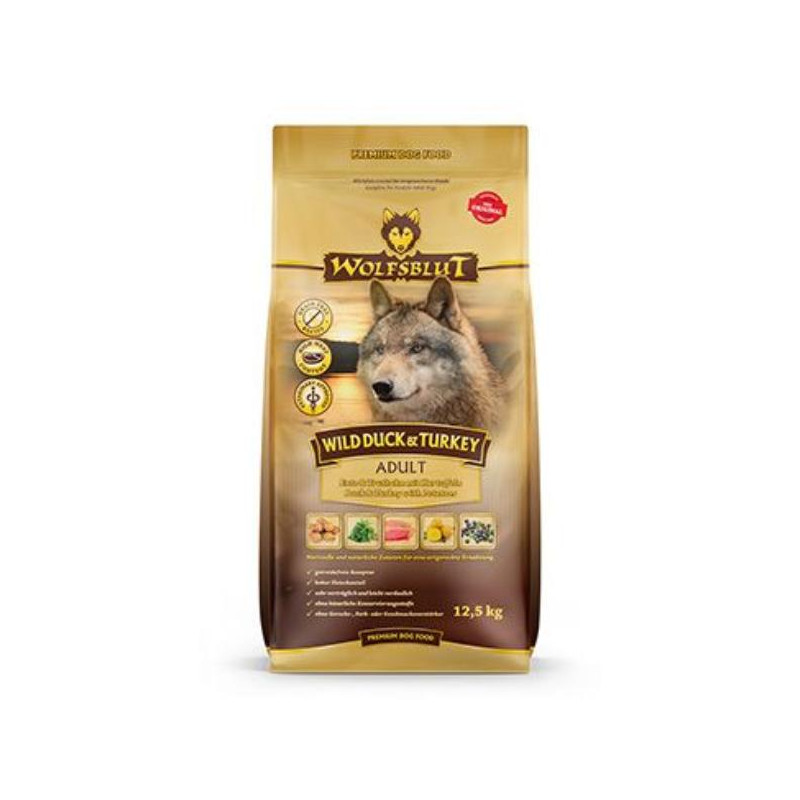 Vlci loví svou kořist od Skalistých hor Severní Ameriky, arktické tundry, hor a lesů Evropy až po pouště a stepi střední Asie. To jim dodává maso a vnitřnosti bohaté na živiny, ale také zeleninu, ovoce, bobule, kořeny a bylinky z obsahu žaludku kořisti. Obilí zde není zahrnuto. Vlk tak přijímá potřebné vitamíny, minerály, stopové prvky, enzymy a druhotné rostlinné látky. Vzhledem k tomu, že vlk je předkem všech psů, naše suché krmivo pro psy Wolfsblut je založeno na přirozených stravovacích návycích vlka. Obsahuje hodně masa nebo ryb v kombinaci se superpotravinami, které obsahují hodnotné ingredience – stejně jako v přírodě, bez obilovin. Náš výběr výjimečných druhů masa a superpotravin bohatých na živiny vychází z vlčích biotopů a jejich pestré stravy. Wolfsblut nabízí každému psovi druhově vhodnou a originální stravu a díky rozmanitosti odrůd si každý najde něco, co snese. Receptura suchého krmiva WILD DUCK & TURKEY kombinuje výživu vlků s nejnovějšími vědeckými poznatky o správné výživě psů.