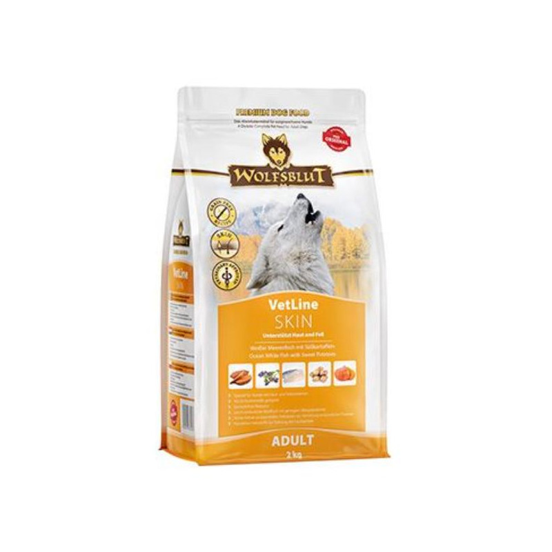 WOLFSBLUT VetLine SKIN je kompletní dietní krmivo pro dospělé psy pro podporu funkce kůže při dermatóze a nadměrném vypadávání srsti a pro snížení příznaků intolerance surovin a živin v souvislosti s chronickým svěděním, zánětem vnějšího ucha a gastrointestinálními onemocněními.