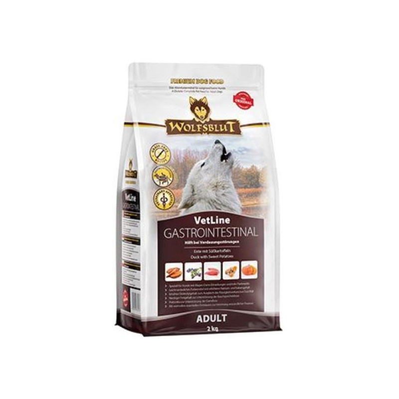 WOLFSBLUT VetLine GASTROINTESTINAL je kompletní dietní krmivo pro dospělé psy ke zmírnění poruch vstřebávání střev a ke kompenzaci nedostatečného trávení a chronické pankreatické nedostatečnosti.