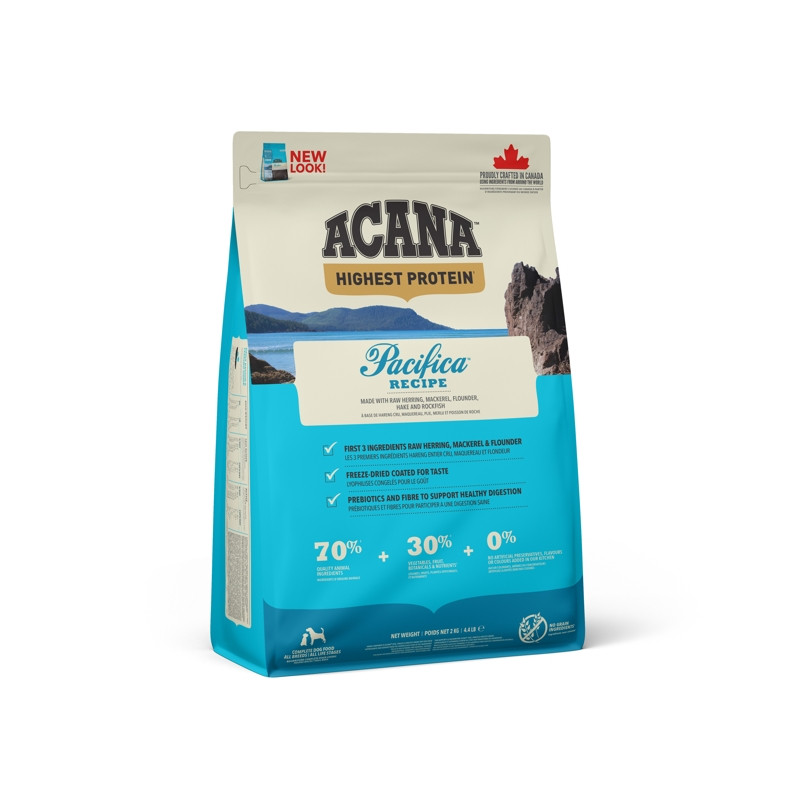 ACANA PACIFICA OBSAHUJE VOLNĚ LOVENÉ SLEDĚ, SARDINKY, PLATÝSE, HEJKY A OKOUNÍKY, DODÁVANÉ ČERSTVÉ NEBO SYROVÉ ZE SEVERNÍHO POBŘEŽÍ OSTROVA VANCOUVER, A NAPODOBUJE TAK PŘIROZENOU STRAVU PSŮ. S NÍZKÝM OBSAHEM SACHARIDŮ A VYSOKÝM OBSAHEM PROTEINŮ Z RYB PRO DOSAŽENÍ VRCHOLOVÉ KONDICE.