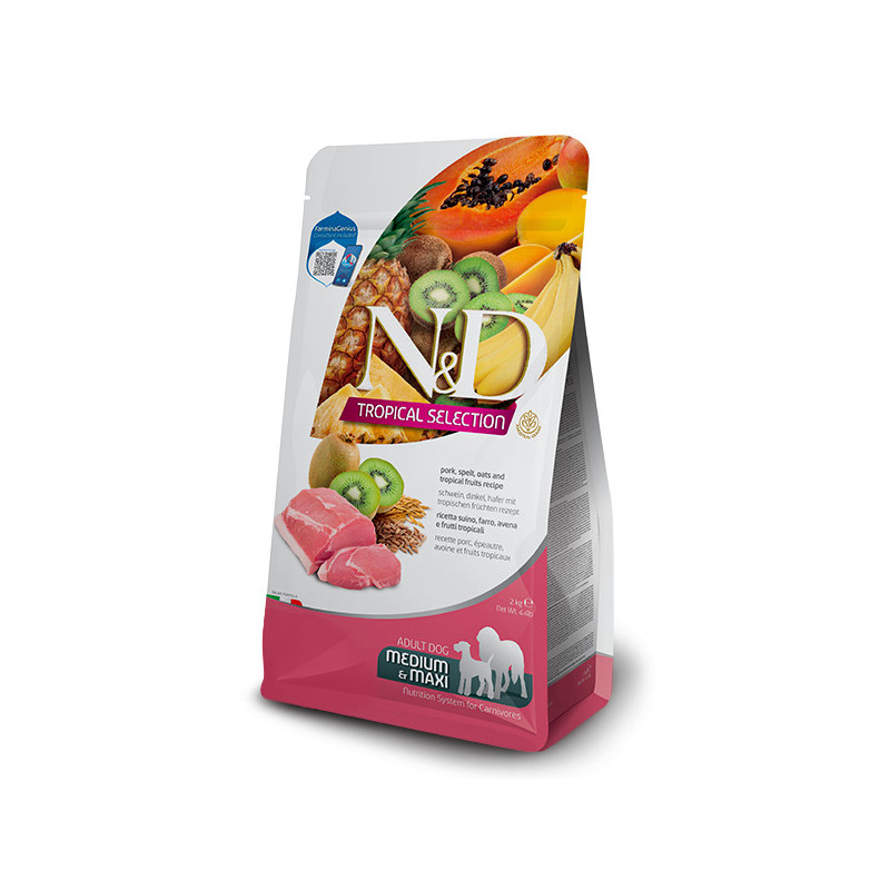 Vepřové, špalda, oves a tropické ovoce. Kompletní krmivo pro dospělé psy.