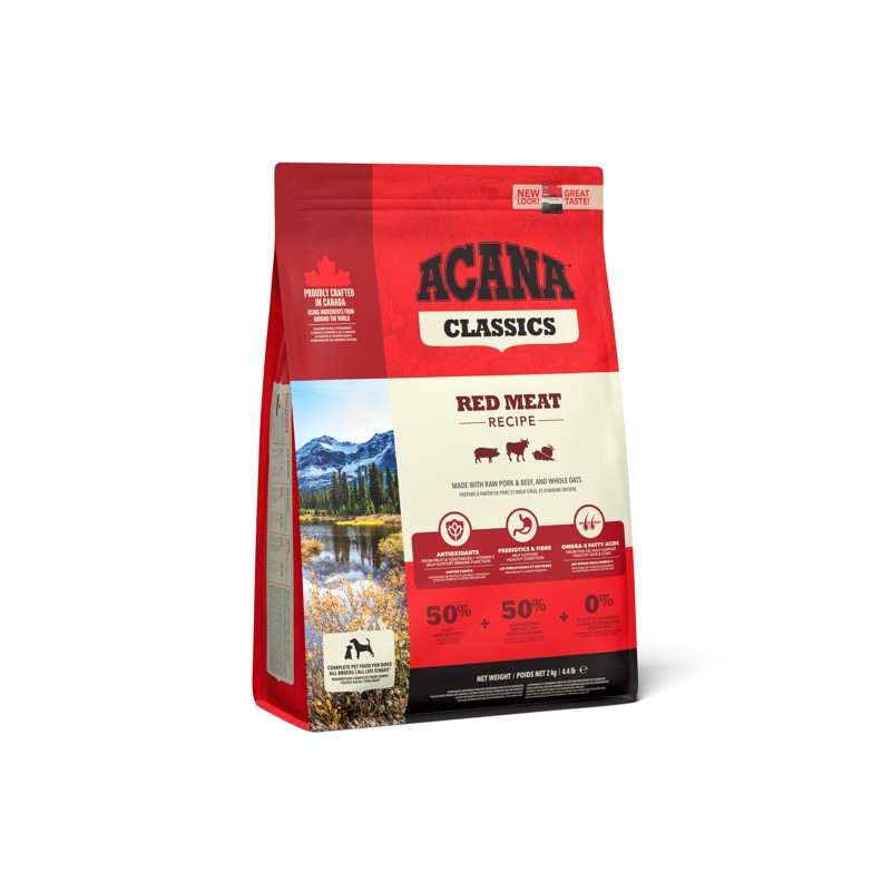 Receptury ACANA® jsou vytvořeny od začátku až do konce s použitím lahodných a kvalitních surovin. Červená masa, výživné ovoce, obiloviny a zelenina v krmivu ACANA Classics Red Meat poskytují vašemu psovi syté a výživné jídlo vyrobené z jednoduchých a zdravých surovin. Obsahuje také ingredience bohaté na živiny, které podporují tři klíčové zdravotní benefity, včetně imunitní funkce, zdravého trávení a zdravé kůže a srsti.