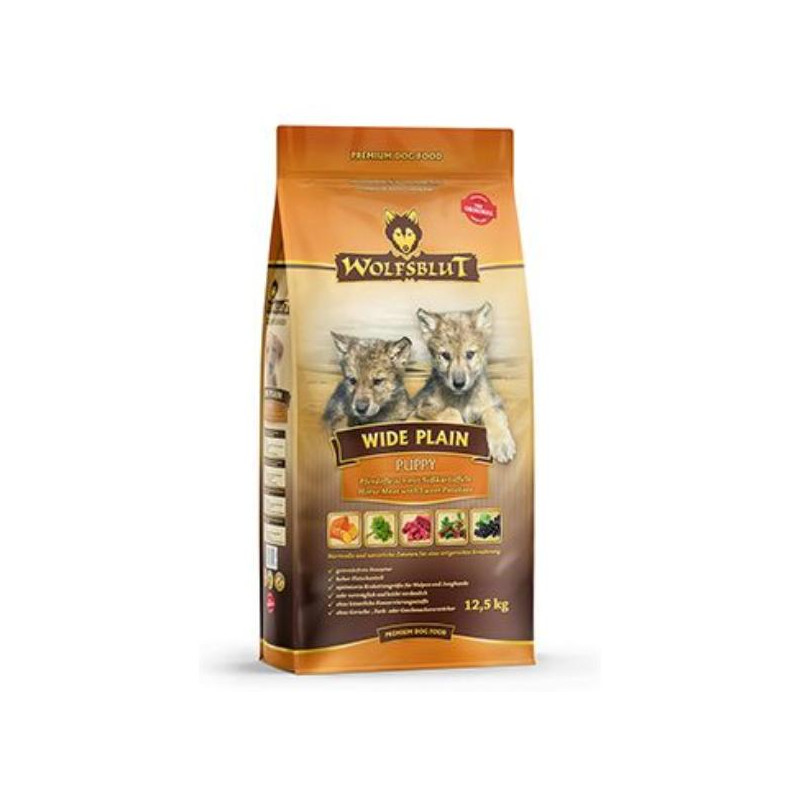 Vlci loví svou kořist ve Skalistých horách Severní Ameriky, arktické tundře, v horách a lesích Evropy a dokonce i v pouštích a stepích střední Asie. To jim poskytuje maso a vnitřnosti bohaté na živiny, ale také zeleninu, ovoce, bobule, kořeny a bylinky prostřednictvím obsahu žaludku kořisti. Obilí zde není zahrnuto. Vlk tak dostává potřebné vitamíny, minerály, stopové prvky, enzymy a druhotné rostlinné látky. Vzhledem k tomu, že vlk je předkem všech psů, naše suché krmivo pro psy Wolfsblut je založeno na přirozených stravovacích návycích vlka. Obsahuje hodně masa nebo ryb v kombinaci se superpotravinami, které obsahují hodnotné ingredience – stejně jako v přírodě, bez obilovin. Náš výběr výjimečných mas a superpotravin bohatých na živiny je založen na vlčím prostředí a jeho rozmanité stravě. Wolfsblut nabízí každému psovi druhově vhodnou a přirozenou stravu a díky rozmanitosti odrůd si každý něco toleruje. Receptura na suché krmivo WIDE PLAIN PUPPY kombinuje stravu vlka s nejnovějšími vědeckými poznatky o správné výživě psů.