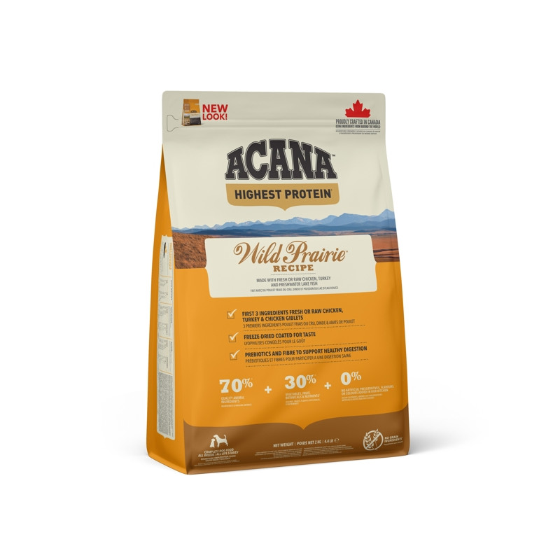 ACANA WILD PRAIRIE JE PLNÁ VOLNĚ CHOVANÝCH KUŘAT, KRŮT, CELÝCH VAJEC Z HNÍZDNÍCH CHOVŮ A VOLNĚ LOVENÝCH RYB, DODÁVANÝCH ČERSTVÉ NEBO SYROVÉ Z NAŠEHO REGIONU V PODÍLU CELÉ KOŘISTI, COŽ DODÁVÁ ŽIVINY PŘIROZENĚ, BEZ POTŘEBY DLOUHÉHO SEZNAMU UMĚLÝCH DOPLŇKŮ. S NÍZKÝM OBSAHEM SACHARIDŮ A VYSOKÝM OBSAHEM ŽIVOCIŠNÝCH PROTEINŮ PRO DOSAŽENÍ VRCHOLOVÉ KONDICE.