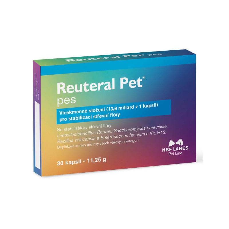 Reuteral Pet je doplňkové krmivo pro psy bez živočišných derivátů, který díky své multikmenové formulaci (13,6 miliard na kapsli) přispívá k stabilizaci střevní mikroflóry. Reuteral Pet pes obsahuje Limosilactobacillus Reuteri, Saccharomyces cerevisiae, Bacillus Velezensis a Enterococcus faecium, které pomáhají udržovat normální rovnováhu střevní mikroflóry.