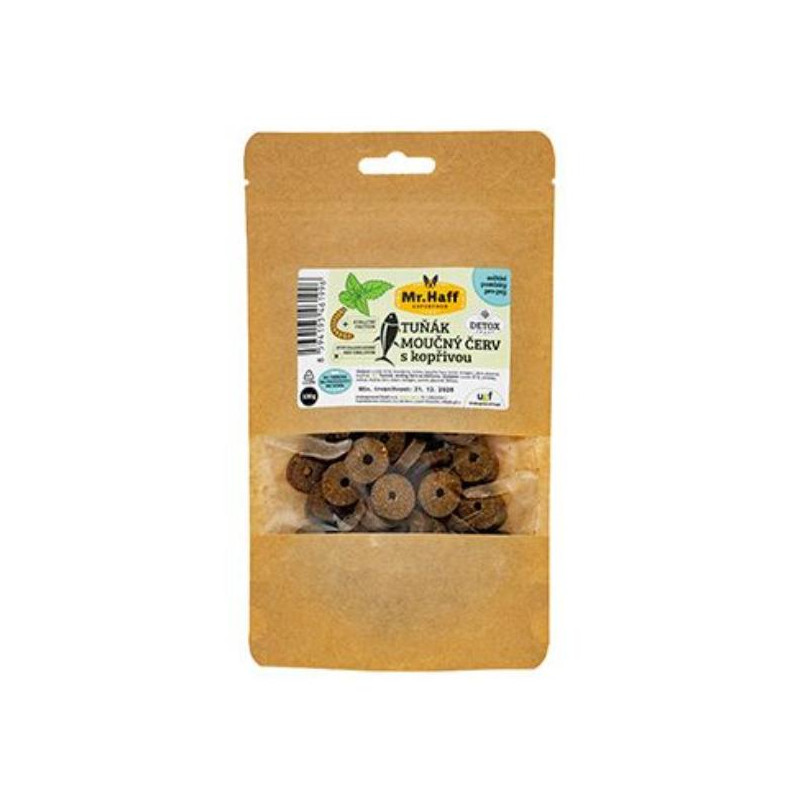 Funkční pochoutky vyrobeny, tak aby podporovaly zdraví a růst všech plemen psů. Kvalitní zdroj živočišného proteinu doplněn o zeleninu bohatou na vlákninu a prospěšné byliny. Chutné kompletní pamlsky se skvěle hodí na výcvik i na doma. Tuňák, moučný červ a kopřiva kromě kvalitních bílkovin a tuků, které poskytuje tuňák i moučný červ obsahuje navíc velké množství minerálních látek a vitamínů. Kopřiva pak pomáhá podporovat metabolismus a je výbornou bylinou při detoxikaci.