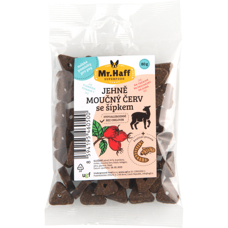 Jehně-moučný červ a šípek je varianta pamlsků, která obsahuje lehce stravitelný jehněčí protein obohacený o protein z moučných červů. Obsažený šípek, díky vysokému obsahu vitamínu C, posiluje imunitu a je vhodným doplňkem pro podporu pohybového aparátu.