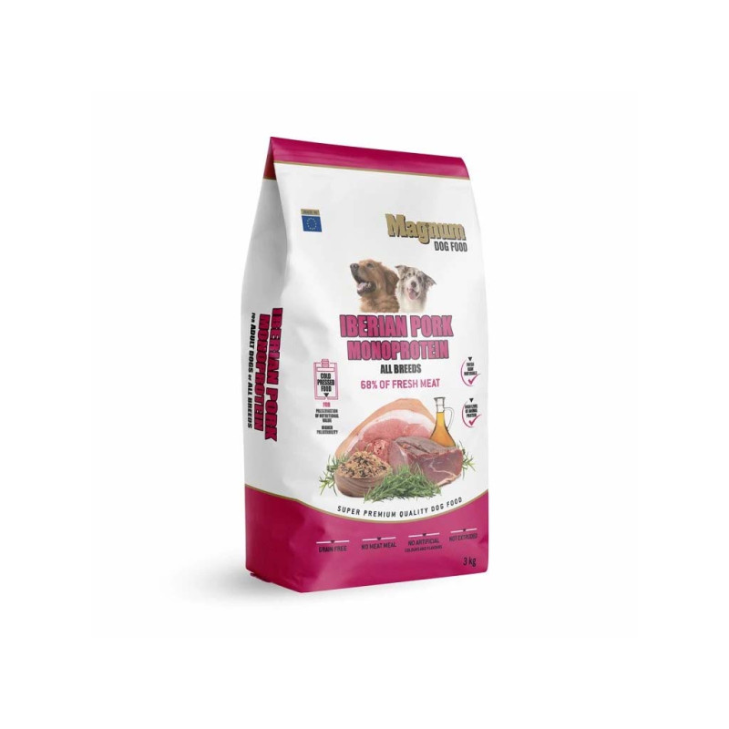 Krmivo Magnum Iberian Pork for All Breeds je vyrobeno bez masových mouček pouze z čerstvého Iberského vepřového masa, bez lepku a bez přidaných tuků. Důležitým faktorem je, že krmivo není extrudováno.