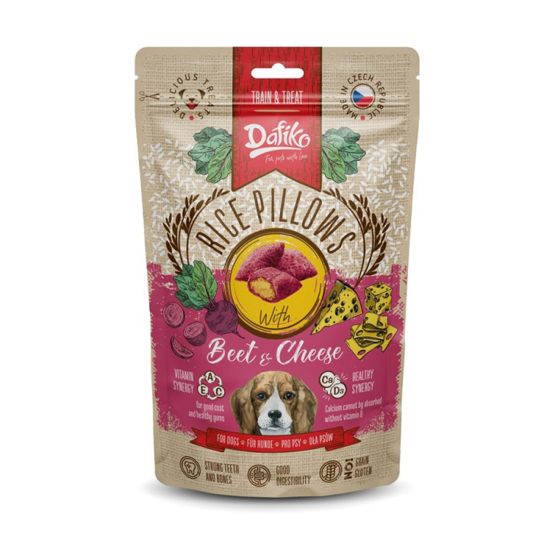 Polštářky obsahují kombinaci vybraných surovin, jako je červená řepa, sýr, karob, skořice, vápník a tuky živočišného původu. Tyto složky přispívají k dobré kondici trávicího traktu a celkové vitalitě psa. Přidané vitaminy podporují imunitní systém a správné fungování organismu. Pamlsek je určen výhradně jako doplněk ke kompletní krmné dávce.