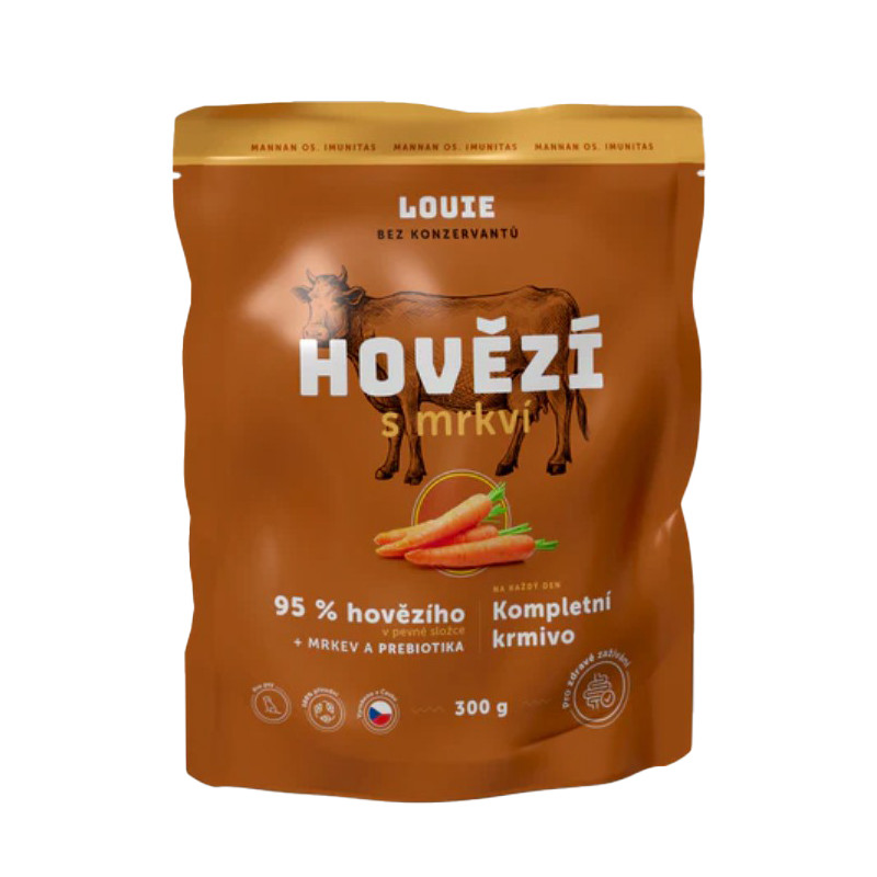 Praktická kapsička plná kompletního krmiva. Obsahuje 95 % hovězího masa v pevné složce a 5 % rostlinné složky, vitamínů a minerálů. Přidaná mrkev dodává psům potřebné živiny a minerály, takže tvůj psí parťák bude mít vše, co potřebuje pro zdravý a aktivní život.