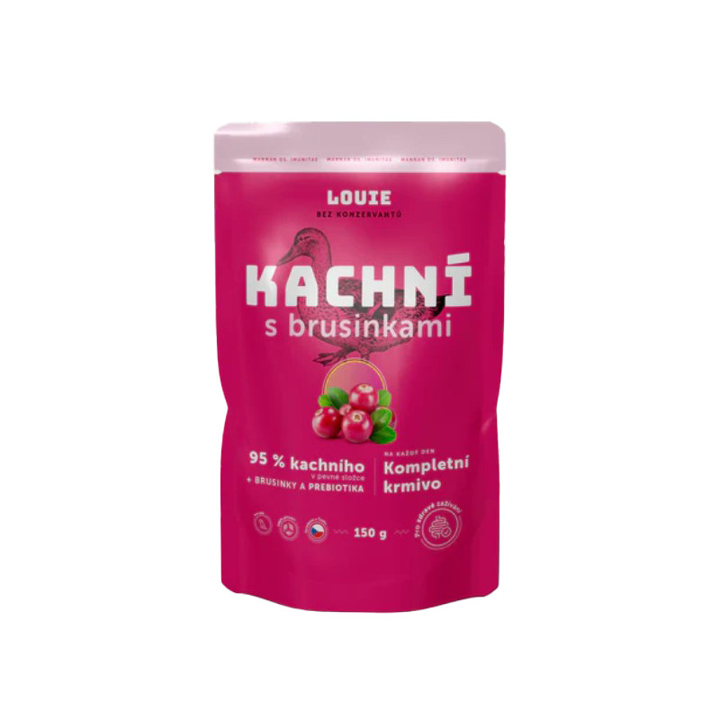 Praktická kapsička plná kompletního krmiva. Obsahuje 95 % kachního masa v pevné složce a 5 % rostlinné složky, vitamínů a minerálů. Přidané brusinky napomáhají udržení zdravé močové soustavy a podporují peristaltiku střev. A po Louie zbyde jen vylízaná miska.