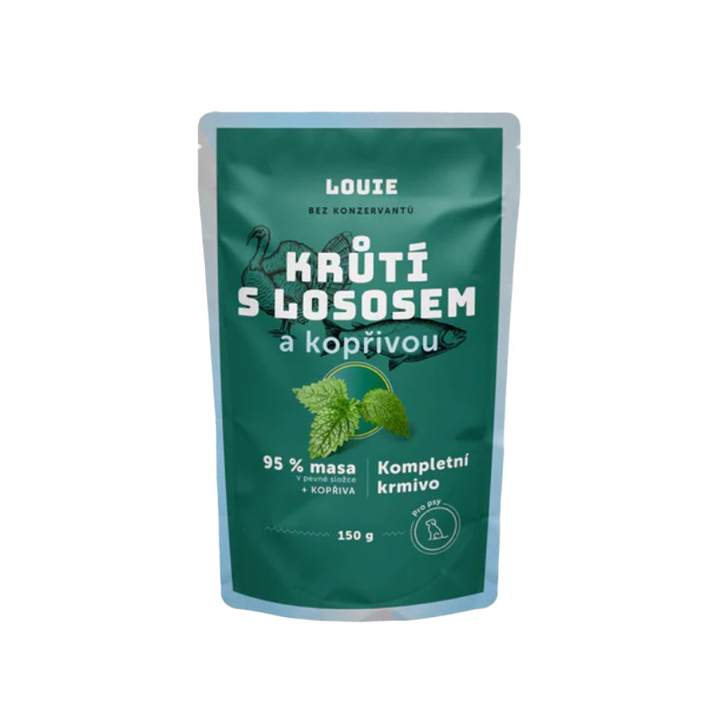 Kompletní krmivo bez obilnin pro psy každého věku i plemene, krůtí s lososem a kopřivou. Nabízí Vašemu miláčkovi možnost stravy z kvalitního masa (95 % v pevné složce). Pro podporu peristaltiky střev a simulaci minoritní rostlinné složky v potravě psů slouží příměs kopřiv. Krmivo neobsahuje žádné konzervanty, dochucovadla ani barviva, pouze 95 % masa, kopřivy, vitamíny a minerály.
