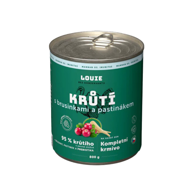 Kompletní krmivo bez obilnin pro psy každého věku i plemene, krůtí s brusinkami a pastinákem. Nabízí Vašemu miláčkovi možnost stravy z kvalitního masa (95 % v pevné složce). Pro podporu peristaltiky střev a simulaci minoritní rostlinné složky v potravě psů slouží příměs brusinek, pastináku.