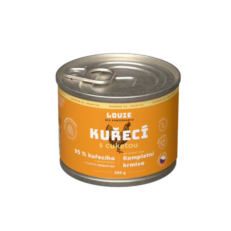 Kompletní krmivo bez obilnin pro psy každého věku i plemene, kuřecí s cuketou. Nabízí Vašemu miláčkovi možnost stravy z kvalitního masa (95 % v pevné složce). Pro podporu peristaltiky střev a simulaci minoritní rostlinné složky v potravě psů slouží příměs cukety. Krmivo neobsahuje žádné konzervanty, dochucovadla, barviva, pouze 95 % masa, 5 % cukety, vitamínů a minerálů.