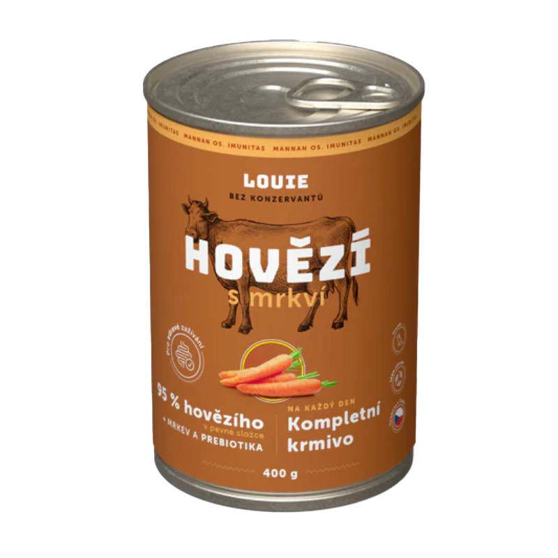 Šťavnaté konzervy obsahují 95 % mletého hovězího masa v pevné složce a 5 % rostlinné složky, vitamínů a minerálů. Obsažená mrkev navíc dodává psům potřebné živiny a minerály. A po Louie zbyde jen vylízaná miska.