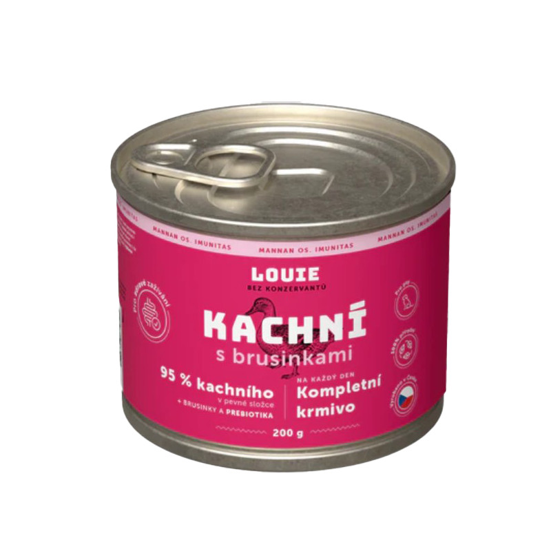 Šťavnatá konzerva obsahuje 95 % kachního masa v pevné složce a 5 % rostlinné složky, vitmamínů a minerálů. Obsažené brusinky napomáhají udržení zdravé močové soustavy a podporují peristaltiku střev A po Louie zbyde jen vylízaná miska.