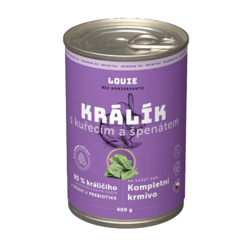 Kompletní krmivo bez obilnin pro psy každého věku i plemene, králík s kuřecím a špenátem. Nabízí Vašemu miláčkovi možnost stravy z kvalitního masa (95 % v pevné složce). Pro podporu peristaltiky střev a simulaci minoritní rostlinné složky v potravě psů slouží příměs špenátu. Krmivo neobsahuje žádné konzervanty, dochucovadla ani barviva, pouze 95 % masa, špenát, vitamíny a minerály.