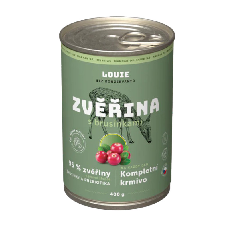 Kompletní krmivo bez obilnin pro psy každého věku i plemene, zvěřina s brusinkami. Nabízí Vašemu miláčkovi možnost stravy z kvalitního masa (95 % v pevné složce). Pro podporu peristaltiky střev a simulaci minoritní rostlinné složky v potravě psů slouží příměs brusinek. Krmivo neobsahuje žádné konzervanty, dochucovadla ani barviva, pouze 95 % masa, brusinky, vitamíny a minerály.