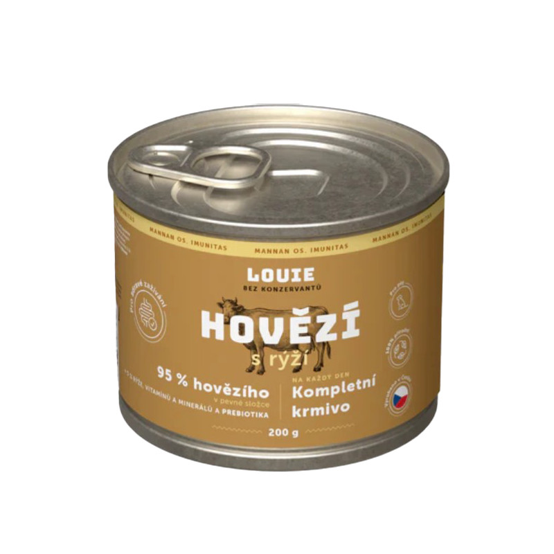 Kompletní krmivo bez obilnin pro psy každého věku i plemene, hovězí s rýží. Nabízí Vašemu miláčkovi možnost stravy z kvalitního masa (95 % v pevné složce). Pro podporu peristaltiky střev a simulaci minoritní rostlinné složky v potravě psů slouží příměs rýže. Krmivo neobsahuje žádné konzervanty, dochucovadla ani barviva, pouze 95 % masa, 5 % rýže, vitamínů a minerálů.