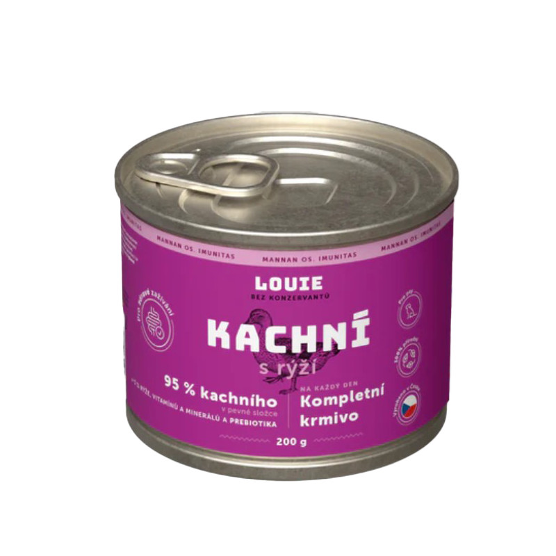 Kompletní krmivo bez obilnin pro psy každého věku i plemene, kachní s rýží. Nabízí Vašemu miláčkovi možnost stravy z kvalitního masa (95 % v pevné složce). Pro podporu peristaltiky střev a simulaci minoritní rostlinné složky v potravě psů slouží příměs rýže. Krmivo neobsahuje žádné konzervanty, dochucovadla ani barviva, pouze 95 % masa, 5 % rýže, vitamínů a minerálů.