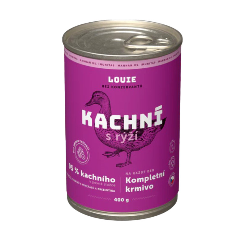 Kompletní krmivo bez obilnin pro psy každého věku i plemene, kachní s rýží. Nabízí Vašemu miláčkovi možnost stravy z kvalitního masa (95 % v pevné složce). Pro podporu peristaltiky střev a simulaci minoritní rostlinné složky v potravě psů slouží příměs rýže. Krmivo neobsahuje žádné konzervanty, dochucovadla ani barviva, pouze 95 % masa, 5 % rýže, vitamínů a minerálů.