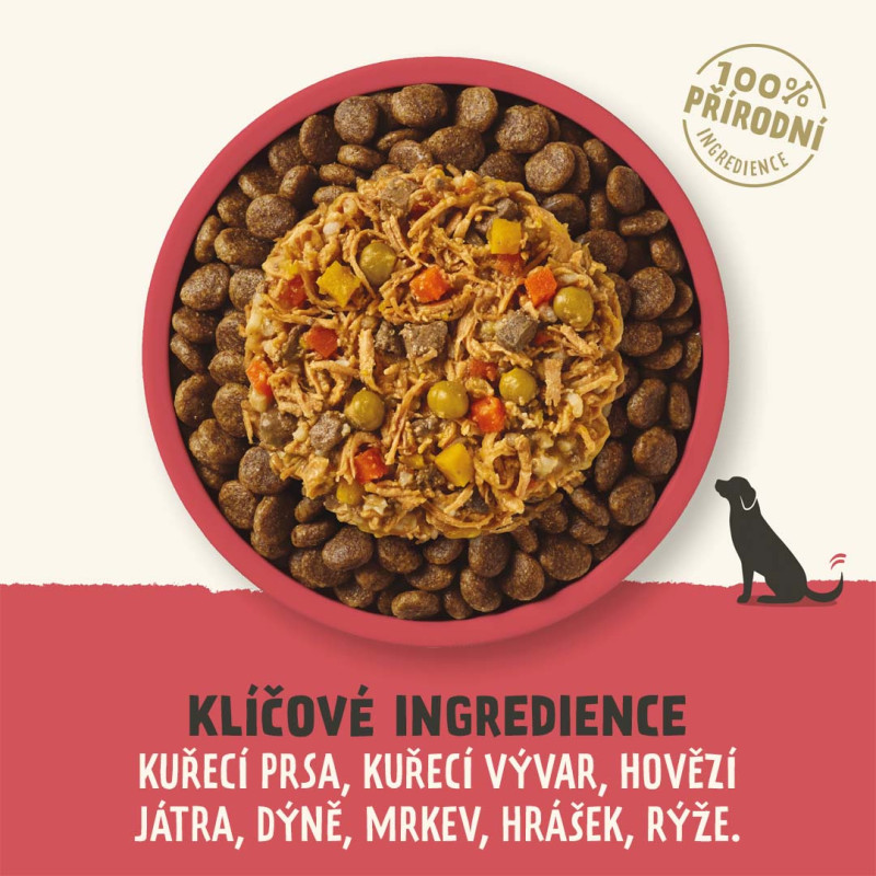 Doplňkové krmivo vhodné pro všechna plemena psů od 3 měsíců věku. Lze podávat jako svačinku, doplněk ke kompletnímu krmivu nebo přimíchat ke granulím pro zvýšení vlhkosti a chutnosti.