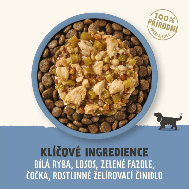Bílá ryba neboli síh je chutná a lehce stravitelná, plná kvalitních bílkovin, minerálů a stopových prvků, jako jsou železo, mangan, jód a selen. Obsahuje také vitamíny A a skupiny B (B1, B2, B3, B5, B6, B9, B12) a cenné nenasycené mastné kyseliny omega-3, které podporují zdraví srdce, mozku i srsti. Stejně bohatý na omega-3 je i losos, který recepturu doplňuje. Tato rybí kapsička je obohacena o zelené fazolky (zdroj vlákniny a vitamínů) a vařenou čočku, která je pro psy snadno stravitelná a doplňuje spektrum aminokyselin. Věděli jste, že správná kombinace rostlinných a živočišných bílkovin podporuje lepší využití aminokyselin a růst svalové hmoty jak u lidí, tak u psů? Po téhle kapsičce se vašemu parťákovi nenafoukne bříško, ale svaly. Kapsičky Applaws pro psy obsahují pouze čisté maso v celých kouscích! Žádné náhražky a imitace masa. Skrz průhledný talířek na obalu hned vidíš, co kupuješ.