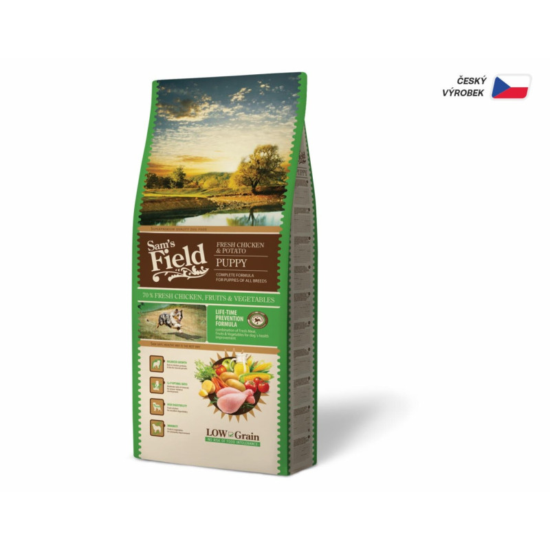 Sam's Field Low Grain Puppy Chicken & Potato. Superprémiové bezpšeničné krmivo s vysokým obsahem kuřete 33 % a kuřecích jater 15 %.